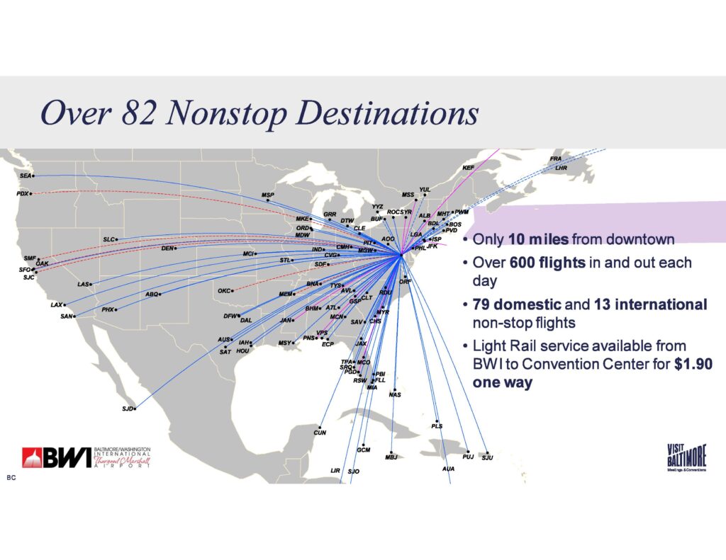 The primary airport servicing Baltimore, MD is Baltimore/Washington International Thurgood Marshall Airport (BWI). With more than 650 domestic and international flight operations daily, BWI Marshall Airport is the easy choice to get you where you need to go. BWI proudly offers 82+ nonstop destinations. It is located approximately 15-minutes from the conference hotel, Hyatt Regency Baltimore Inner Harbor.